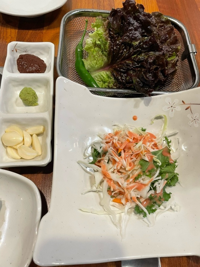 샐러드에 쌈채소, 와사비까지 준비되어서