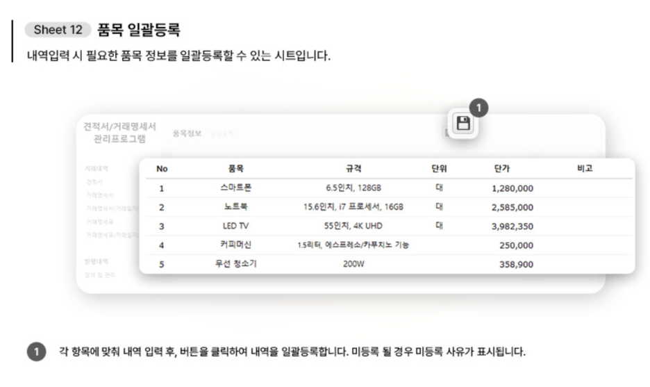 품목/규격/단위/단가/비고를 한꺼번에 입력할 수 있어요.