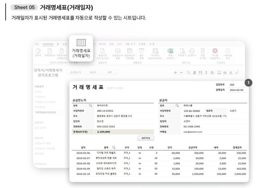 견적서/거래명세서 관리 엑셀 프로그램(견적서 · 일자별 거래명세서/거래명세표 자동작성, 발행