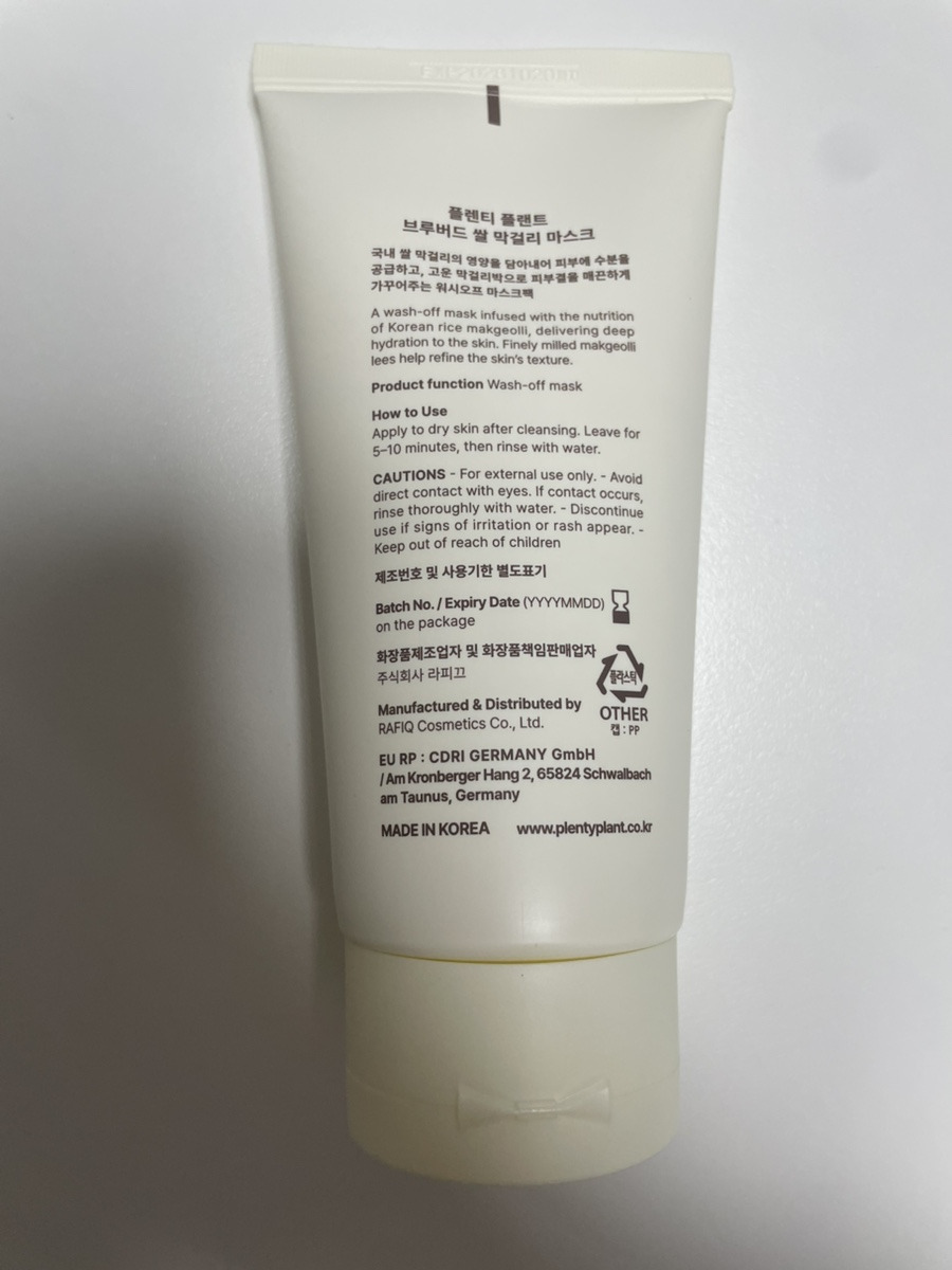 플렌티 플랜트 브루버드 쌀 막걸리 마스크 워시오프 팩 국내산 술지게미 각질 세안 팩 150g - 워시