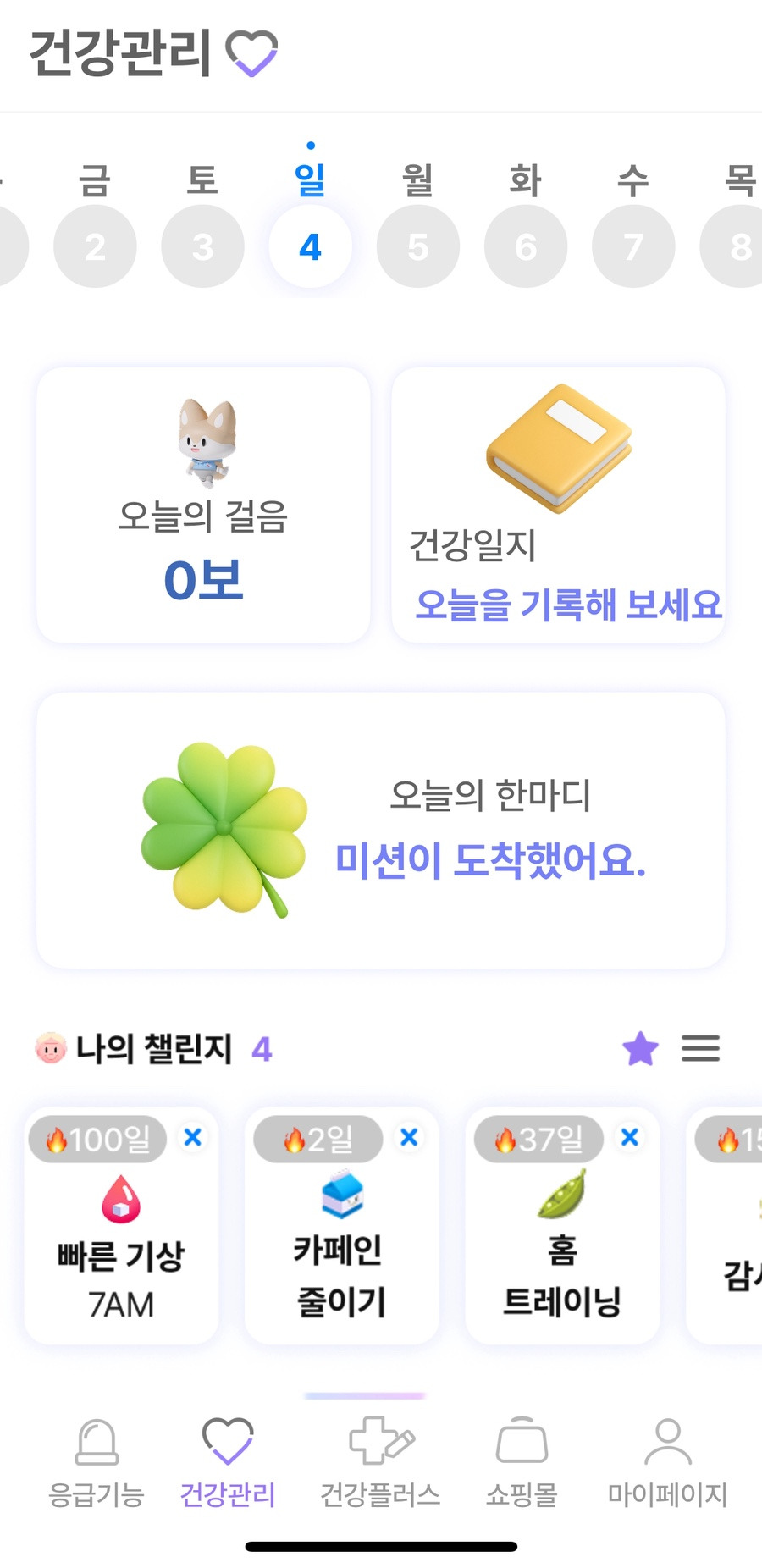 ‘건강관리’ 탭에서 오늘의 걸음 수, 건강일지, 오늘의 미션까지 한눈에 보여요!