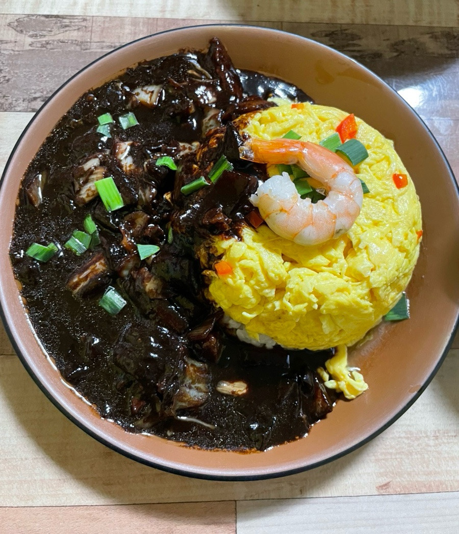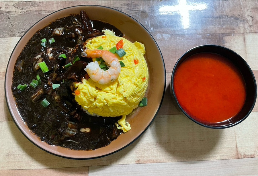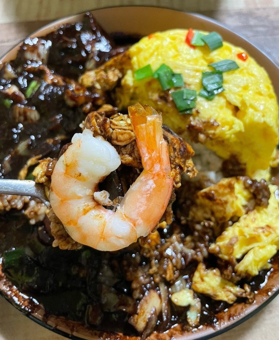 한 입 떠보면 오믈렛+짜장+새우의 황홀한 삼중주