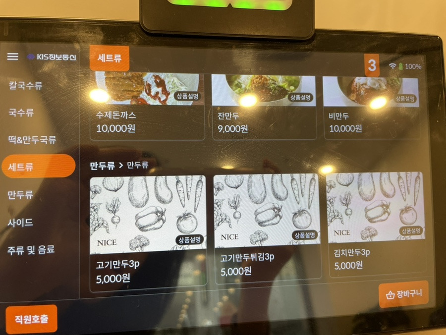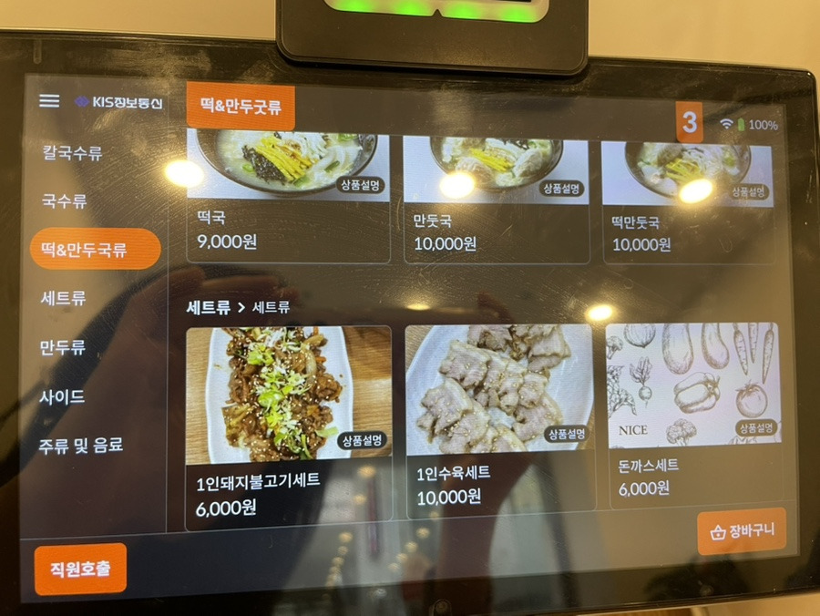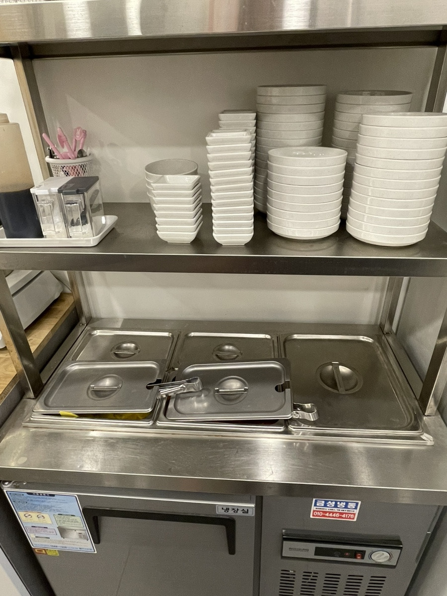 메뉴 주문은 키오스크로 쓱~ 반찬이랑 식기는 직접 가져다 먹는 방식이에요.