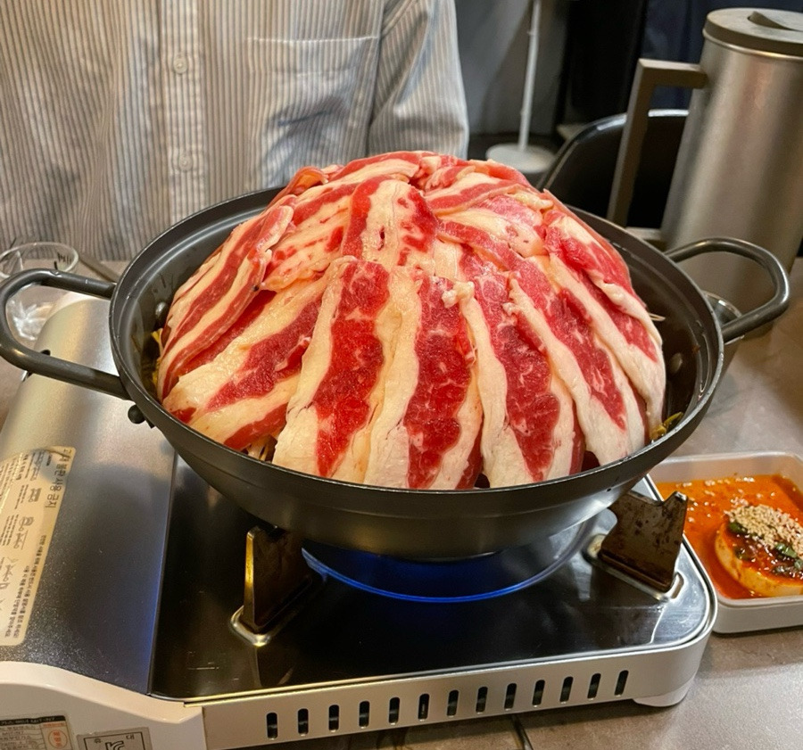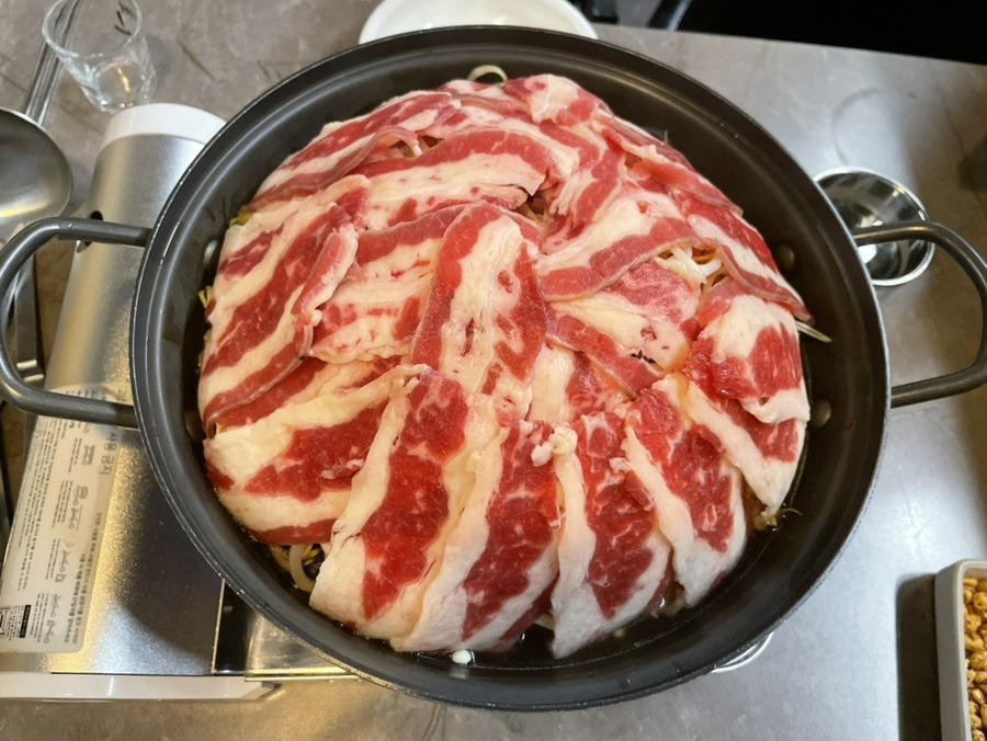 큼직한 냄비 위로 차곡차곡 겹겹이 쌓인 소고기가 산처럼 올려져서 나와요.