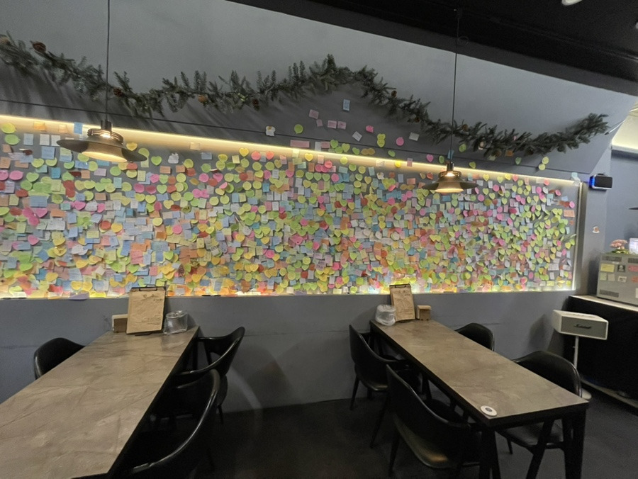 안으로 들어가면 제일 먼저 눈에 띄는 건, 바로 이 형형색색의 포스트잇 벽이에요!