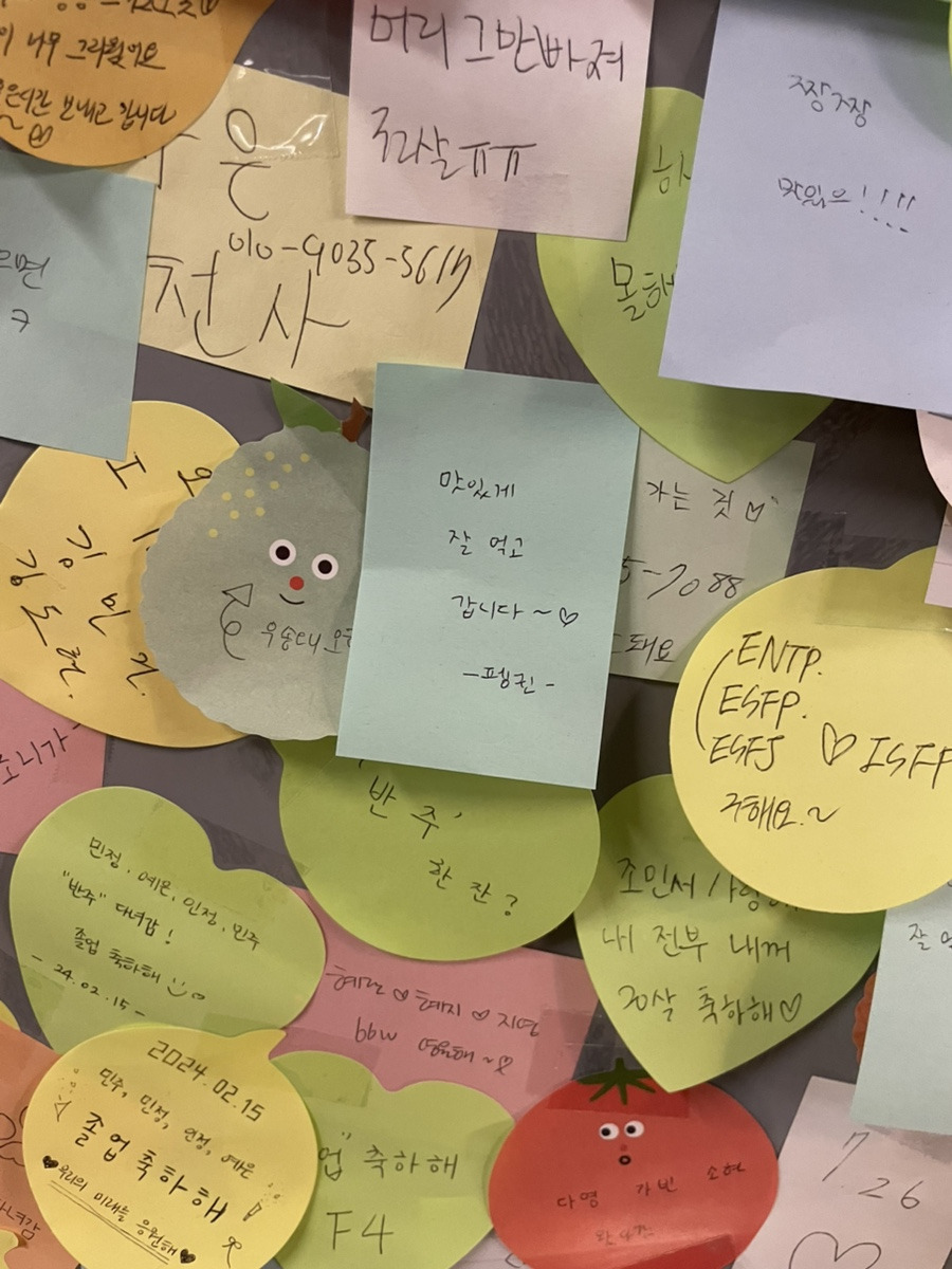 손님들이 남긴 귀여운 메모들이 가득 붙어 있어서 구경하는 재미도 쏠쏠하더라고요.