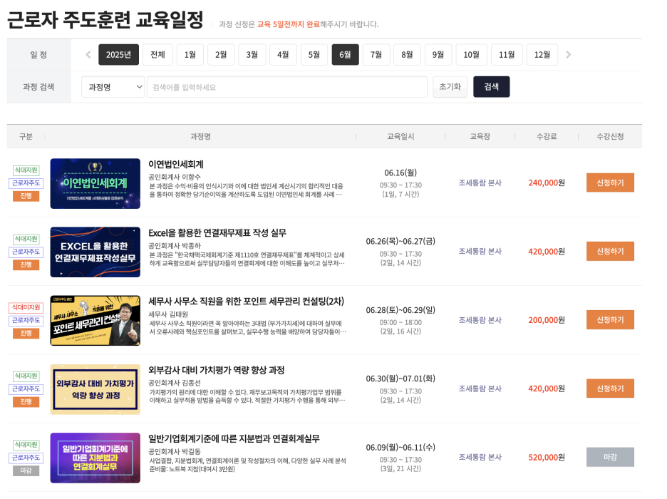 - 훈련과정은 오프라인 과정 중심이며, 회계기초부터 고급세무까지 다양하게 준비되어 있어요!