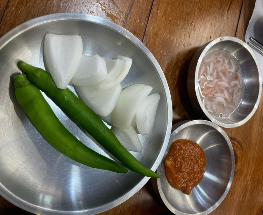 깍두기, 무생채, 새우젓, 양파와 고추까지 국밥과 찰떡궁합 밑반찬 세팅!