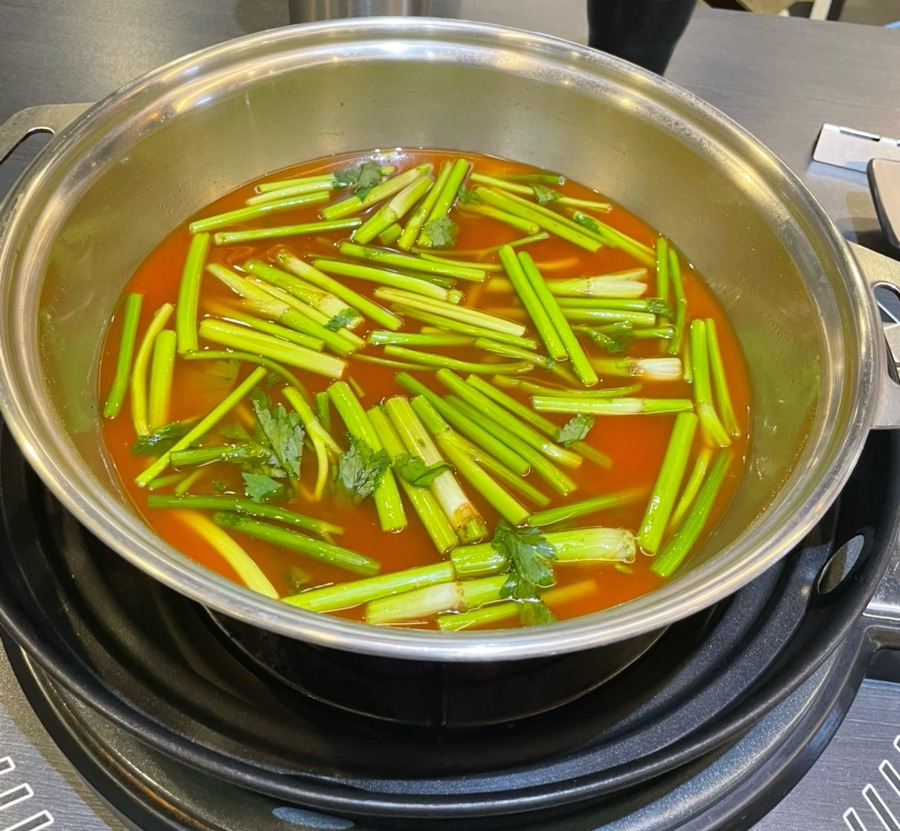 샤브샤브 육수는 미나리가 듬뿍 들어간 칼칼한 국물로 선택했어요. 국물이 끓자마자 🌿미나리 향이 확~ 올라오는데, 입맛 돋우는 향이 장난 아니에요.