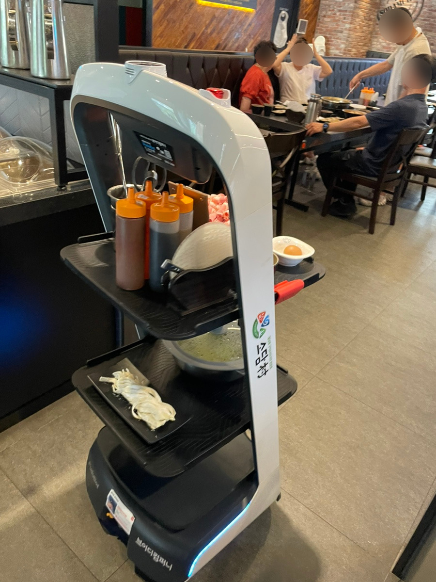 서빙 로봇이 이렇게 저희 테이블로 월남쌈 세트와 샤브샤브 고기를 가져다주는데, 완전 귀엽고 편리!