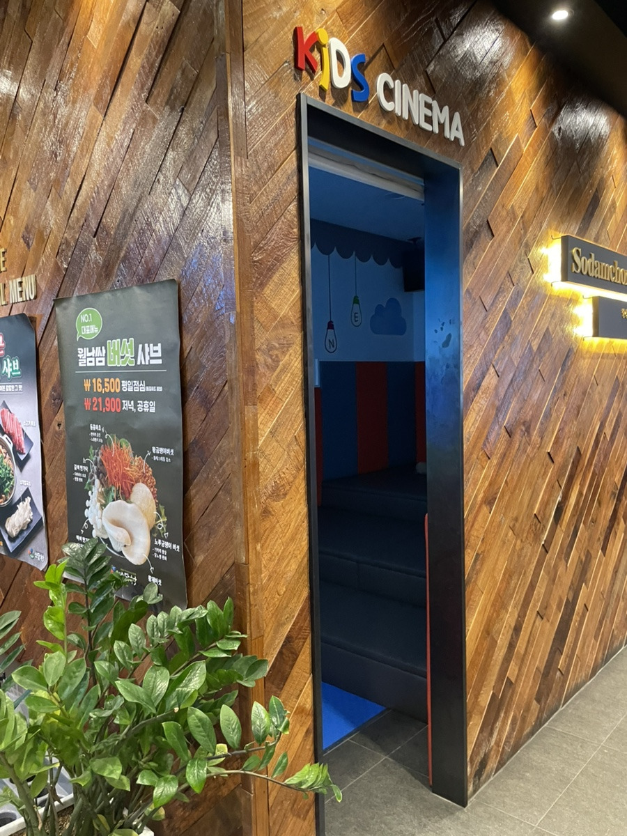 식사하는 동안 아이들이 놀 수 있는 작은 영화관 공간이에요.